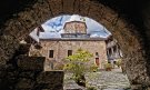 The Monastery of Agios Georgios was moved to its present location during the Ottoman occupation, specifically the 14th century, because it was flooded by the waters of the lake. The new monastery was inaugurated in 1754. It features a courtyard, in the center of which is the Church of the Saint, in the basilica style with a dome. According to the inscription, it contains frescoes by Panagiotis of Ioannina, rare in their beauty, crafted in the period from 1762 to 1768. It has excellent an excellent gilded templo of 1762, depicting the Old Testament, and a large wooden chandelier, inspired by the technique of Athos, decorated with small icons. After 1770 the monastery became very powerful through donations, and helped financially the Greek Revolution of 1821.